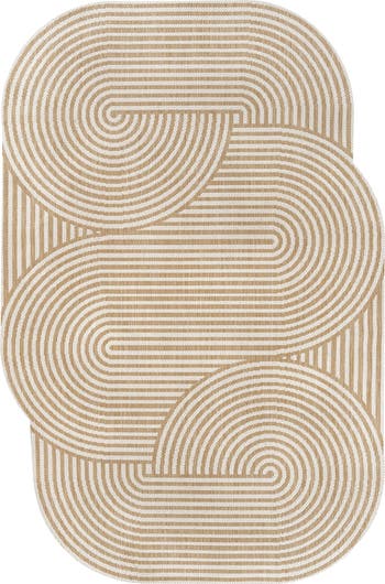 This modern arch rug is inspired by mid-century Scandinavian designs. Durable synthetic fibers are woven into an arch and stripe pattern. Use this stylish geometric rug outdoors, or in the bedroom, living room or dining room.