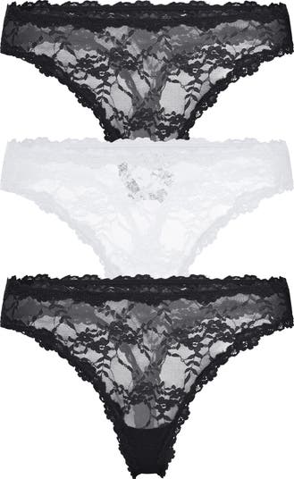 Scalloped edges add to the delicate look of these stretchy and sheer floral-lace thongs designed to disappear under clothing.
