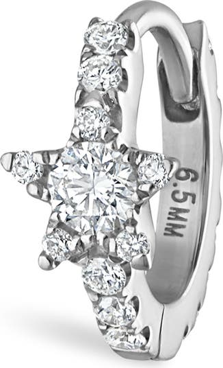A hinged huggie reflecting the NYC-based jewelry designer's luxe yet whimsical aesthetic lights ups your ear with a twinkling diamond star framed in pavé.