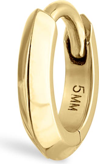 A sleek knife edge sharpens the dimensions of a 14-karat-gold hoop earring.