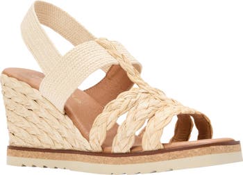 Woven raffia trim brings unmistakable earthy vibes to a slingback sandal set on a just-right wedge heel.