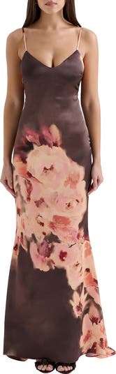 Serve up elegance in this floor-sweeping satin gown with a beautiful floral placement print and a stunning cowl back.