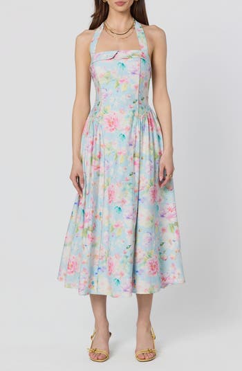 Retro '50s-inspired elegance informs the notched bust and halter-neck silhouette of this midi dress, while structured hip pleats and side-seam pockets bring modern ease.
