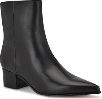 A pointy toe and wrapped block heel balance a poised bootie furnished with a side zipper for easy entry.