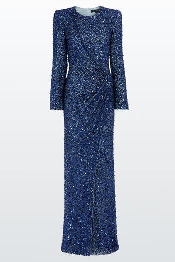 Fully embellished with light-catching sequins, this gown features a draped waist detail that adds shape and movement. The high neckline and long sleeves offer a sleek, balanced silhouette. Shoulder structure adds subtle definition for a confident, refined look. A polished option for formal dinners, award nights or black-tie occasions.