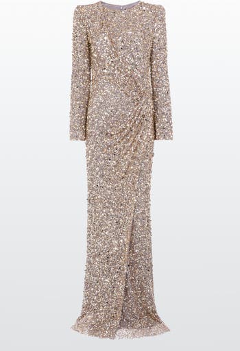 Fully embellished with light-catching sequins, this gown features a draped waist detail that adds shape and movement. The high neckline and long sleeves offer a sleek, balanced silhouette. Shoulder structure adds subtle definition for a confident, refined look. A polished option for formal dinners, award nights or black-tie occasions.