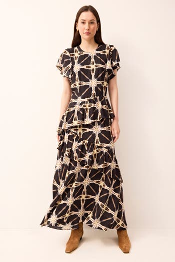 An airy 65% rayon/35% silk-blend maxi in Polaris tie-dye, the Marie Oliver Quinby dress pairs a fitted crewneck bodice with flounce sleeves and a tiered, asymmetric flounce skirt. Fully lined with a center-back invisible zipper and hook-and-eye closure for a tailored fit. Versatile for winter occasions—from birthday dinners to after-work cocktails; hand wash with gentle detergent and hang to dry or dry clean.