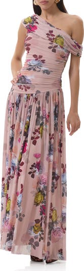 A gauzy floral overlay makes this asymmetric dress an enchanting option for your next occasion.