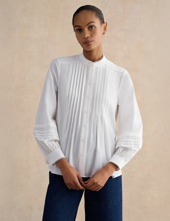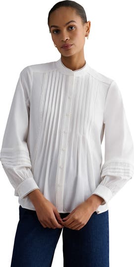 Softly pleated button-front blouse with mandarin collar, sculpted sleeves, delicate scalloped trim and airy drape for confident workday to evening transitions.