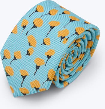 The Marigold Bloom silk tie showcases printed golden blooms set against a refined blue micro - check ground, balancing vibrancy with structure. The warm golden florals lend a cultivated elegance, while the crisp detailing preserves a polished, tailored presence. Distinct yet composed, it offers a confident expression suited for both business and elevated social settings. At Knottery & Co., every silk tie is brought to life through ten meticulous steps of artisan craftsmanship. Designed to move with you, it becomes a quiet yet assured expression of confidence.