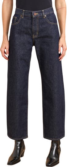 These retro-modern jeans in non-stretch cotton have a mid-rise, curved barrel leg that flatters the waist and leg. Perfect with tees, cropped tops, or sweaters.
