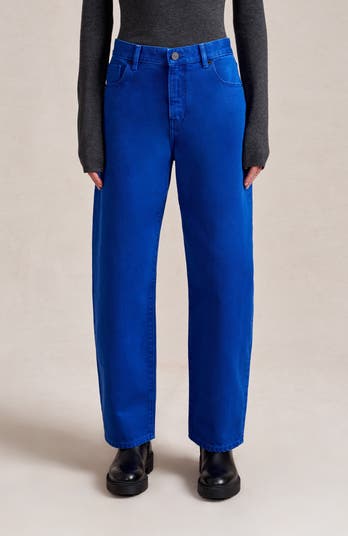 These retro-modern jeans in non-stretch cotton have a mid-rise, curved barrel leg that flatters the waist and leg. Perfect with tees, cropped tops, or sweaters.