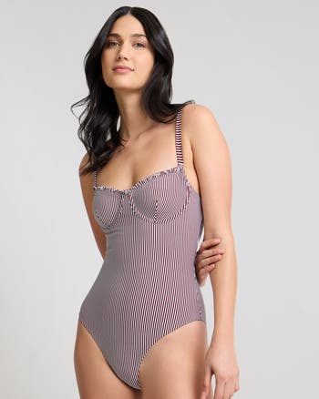 Made from seersucker swim fabric, this one-piece features underwired cups finished with ruffled trim, offering structure with tactile texture.