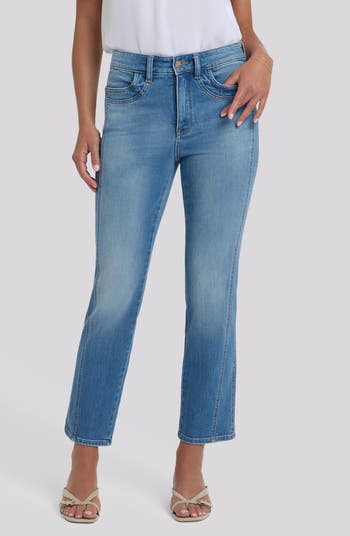 Ankle-length straight-leg jeans offer a fit you'll love with a high waist, stretchy denim and Lift Tuck® Technology that smoothes and supports in front and lifts in back. This pair stands out with paneled details at the pockets and curved side seams that create a fashion-forward look.