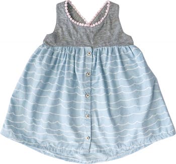 A soft knit bodice with crossback straps and embroidered trim tops this flouncy poplin dress fashioned with a button-front skirt