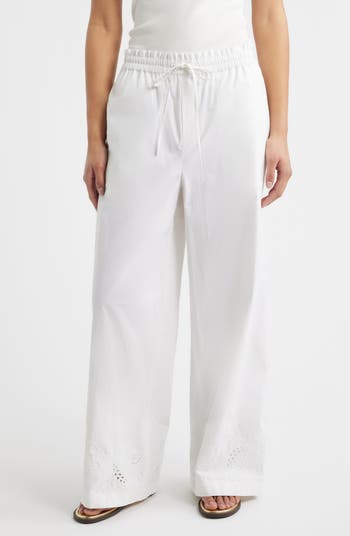 Airy eyelets and tonal embroidery enhance the texture and charm of these tie-waist pants cut from breezy cotton and punctuated with drapey wide legs.
