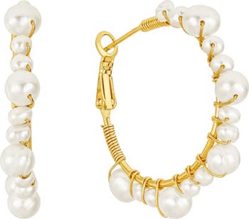 Wire-wrapped pearls add dimension and charm to these statement-making gold hoops.