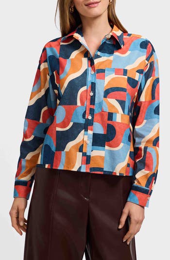 A bold geometric pattern covers this soft cotton-corduroy button-up cut in a boxy, modern fit with a patch pocket at the chest.