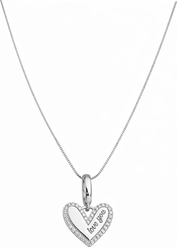 Timeless, romantic, and effortlessly elegant, the Marina “Love You” Pavé Heart Necklace is designed to say everything without a word.\nThis delicate heart pendant features a softly engraved “love you” message, framed by a halo of shimmering pavé cubic zirconia for refined sparkle. Suspended from a sleek, lightweight chain, the polished heart silhouette makes this necklace perfect for everyday wear while remaining meaningful enough for special moments.