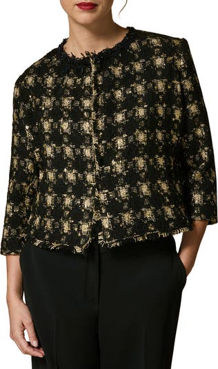 Turn up the shine in the cooler seasons in this yarn-dyed jacket showcasing embroidered passementerie around the neckline and a concealed stud placket.