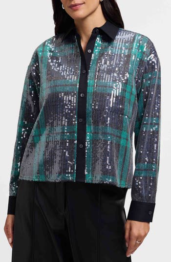 Lustrous sequins illuminate this plaid button-up shirt crafted from a soft cotton-blend with a bold contrast trim.