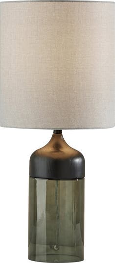 Black wood and smoked glass make up the contemporary design of this lamp that adds a modern accent to the living or bedroom.
