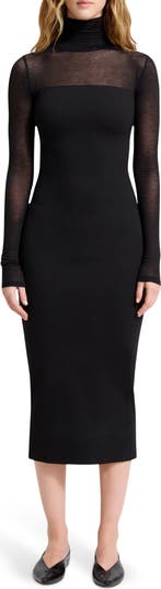 A shape-retaining ponte midi is made in a figure-sculpting silhouette and accented with a mesh yoke and sleeves.
