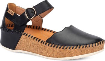 A contoured cork footbed lends ample comfort to this leather wedge flat featuring ornate details like scalloped edges and whipstitch trim.