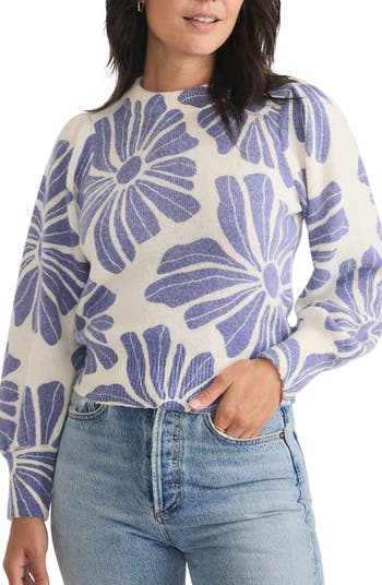 Bold blooms explode across a fuzzy alpaca-kissed crewneck sweater framed by balloon sleeves.