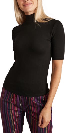 Soft ribbing lends a shapely fit to this sophisticated mock-neck top that's framed by abbreviated sleeves.