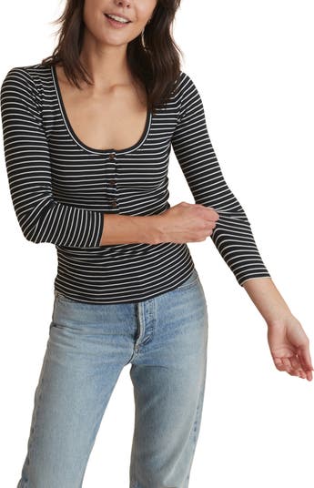 Ribbed and striped, this scoop-neck henley is seriously stretchy so that it hugs you in all the right places for a sleek finish that's cute for day or night.