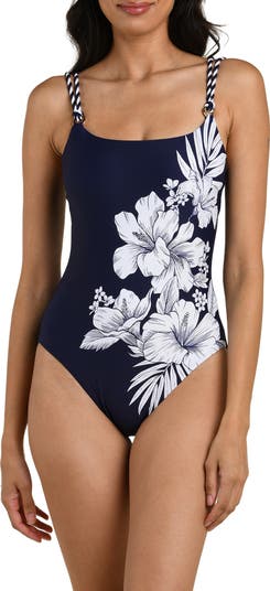 Rope-inspired trim brings coastal charm to this one-piece swimsuit featuring a perfectly placed floral pattern and a curve-sculpting fit.