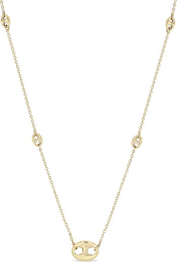 Puffy mariner stations enhance the elegance of a delicate chain necklace crafted from warm 14-karat gold.