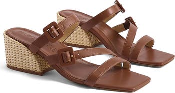 A contrasting block heel adds the perfect flourish of casual appeal to a well-cushioned sandal topped with smooth leather straps.