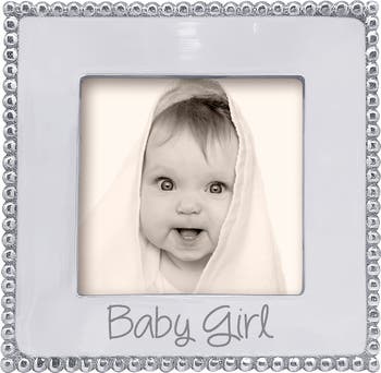 Recycled aluminum buffed to a glossy finish polishes a picture frame styled with beading around the exterior and Baby Girl engraved under the window.