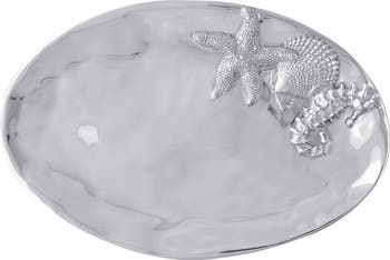 Beautiful sea-themed engraving shimmers on a handcrafted aluminum tray that brings instant oceanic charm to your table setting.