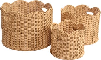 This basket set combines the charm of woven texture with the durability of polypropylene resin reinforced by a sturdy metal frame. The scalloped edge design and integrated cut-out handles provide both decorative flair and practical use. Perfect for organizing essentials, these baskets bring a versatile and stylish solution to storage.