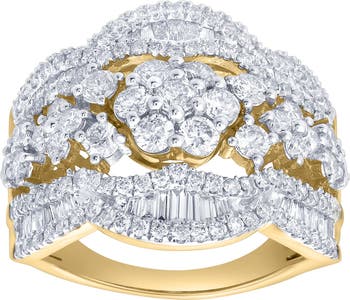Brilliant and boldly elegant the Mariselle Diamond Cluster Ring features 2.00 carats of natural diamonds set in glowing 14k gold. A radiant round diamond cluster center is framed by layered rows of sparkle while sleek baguette diamond accents add a refined high shine dimension across the band. Designed for maximum brilliance Mariselle delivers the look of a luxe statement ring with timeless glamour. Perfect for anniversaries celebrations or elevating everyday style it shines beautifully worn solo or paired with classic bands. Expertly made with ethically sourced natural diamonds. Diamond carat weight may vary up to 0.05 carats from the stated weight.