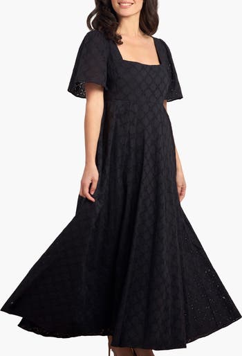 The Marisol Cotton Broderie Short Sleeve Ankle Gown. An ethereal ankle gown crafted from cotton broderie in a delicate diamond design. Featuring softly fluted sleeves, a circle-cut skirt and a shirring panel at the back bodice for ease of wear and fit, the silhouette offers light movement and comfort.