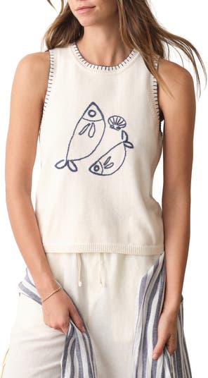Whipstitch trim frames this cozy cotton sweater-tank embroidered with beachy graphics at the front.