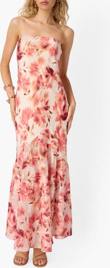 Softly focused blooms tell an enchanting style story for a strapless silk chiffon dress that's ready for the party circuit.