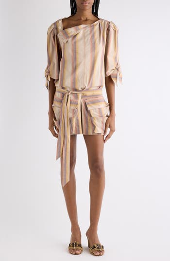 Soft ombré stripes bring a vintage feel to this cotton boat-neck minidress cinched with a wrap-style belt at the waist. Deep pleats at the shoulders provide volume to abbreviated sleeves tied at the cuffs, while roomy layered front pockets create a utility aesthetic.