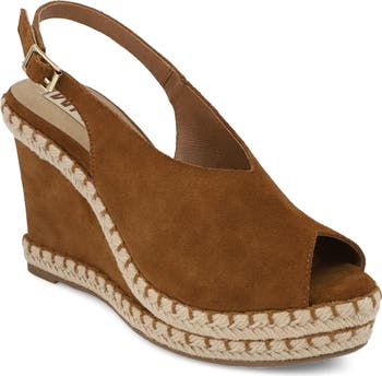Woven jute wraps the platform and wedge heel on an espadrille-inspired sandal shaped from supple suede sand featuring a stylish peep toe.