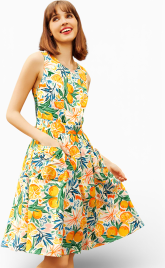 Consider this your official invitation to linger a little longer at the flower stand. The Market Day Dress from our ModCloth namesake label brings sunny-day charm with a classic fit-and-flare silhouette that twirls just right, a sleeveless bodice made for warm breezes, and a waist seam that creates an effortlessly flattering shape. A playful tie at the back lets you customize the fit (and adds a charming bow), while the lively citrus-inspired print delivers instant joy. Finished with roomy pockets for stashing small treasures—or an extra orange—this dress is ripe for compliments from brunch to golden-hour strolls.