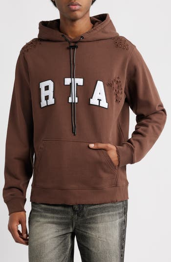 Bold collegiate lettering sets a varsity-forward tone on this distressed hoodie designed with frayed detailing and finished with a drawcord-toggle hood for worn-in edge.