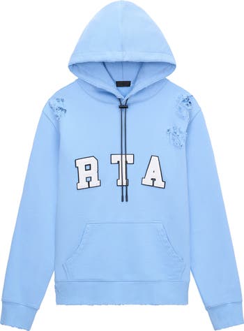 Bold collegiate lettering sets a varsity-forward tone on this distressed hoodie designed with frayed detailing and finished with a drawcord-toggle hood for worn-in edge.