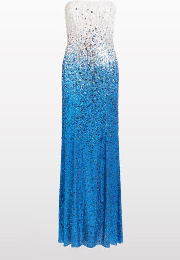 This gown captivates with its sleek strapless silhouette and fluid ombr effect. The fitted bodice flows effortlessly into a floor-skimming skirt, creating a look of modern glamour and movement. A striking design for statement-making evening moments.