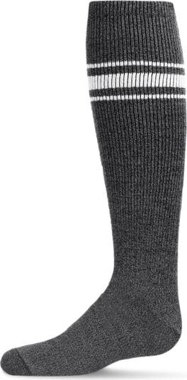 For a throwback to a time way before your little one was born, give them a pair of these Marled Ribbed Stripe Girls Knee High Socks for size. This athletic style ribbed sock is adorned with three stacked stripes as a callback to the sports styles of yesteryear. Made with a cotton blend, these socks are comfortable and soft for long time wear on the field and off.