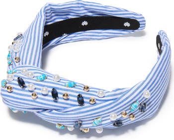 Lele Sadoughi Marlene Embellished Seersucker Headband, Main, color, Blue