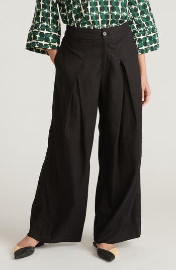 Designed to sit high and fall wide, these pants get their fluid swing from a soft, stretchy linen blend that moves with you and keeps its cool. The neat pleats at the waist add a tailored note that keeps the look polished even when you’re on the go.